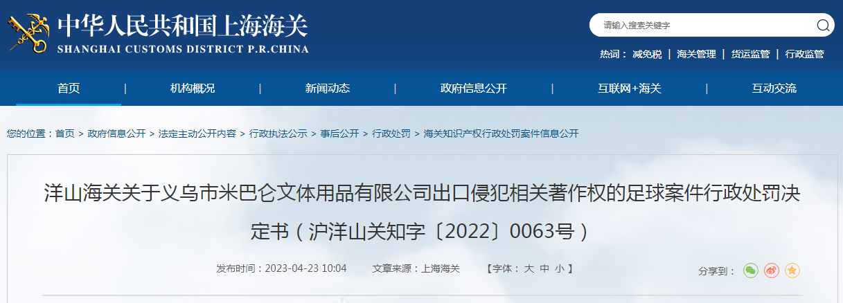 中国质量新闻网讯 近日,洋山海关发布关于义乌市米巴仑文体用品有限公司出口侵犯相关著作权的足球案件行政处罚决定书(沪洋山关知字〔2022〕0063号)。