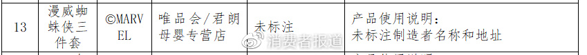 又如标称商标为MARVEL的漫威蜘蛛侠三件套产品使用说明未标注制造者名称和地址。