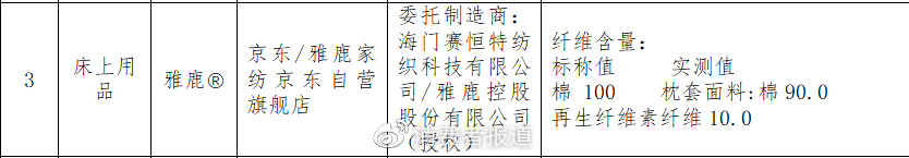 如一款标称委托制造商为海门赛恒特纺织科技有限公司/雅鹿控股股份有限公司(授权)的雅鹿床上用品,纤维含量标称值为棉100%,枕套面料实测为棉90%,再生纤维素纤维10%。