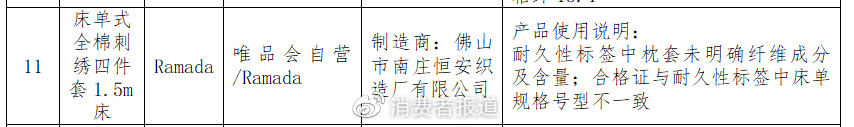 诸如标称商品为Ramada的四件套耐久性标签中枕套未明确纤维成分及含量;合格证与耐久性标签中床单规格号型不一致。