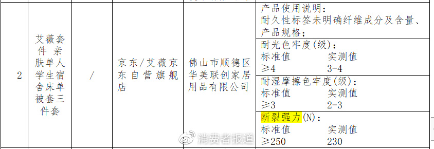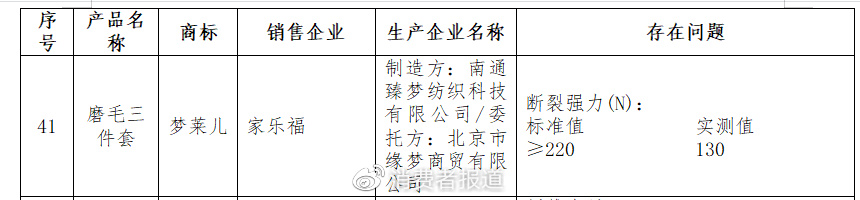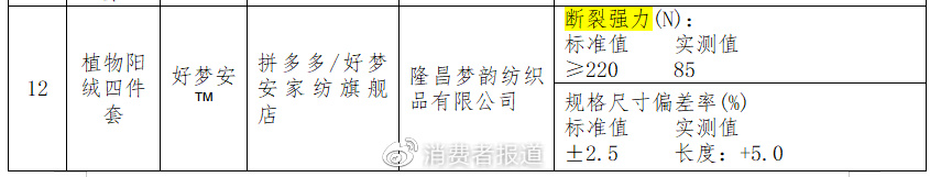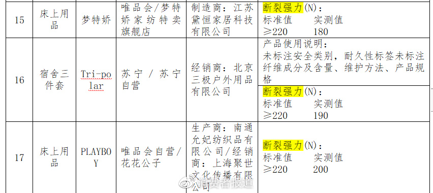 此次检测中,有多款产品断裂强力实测值低于标准值(≥220N)。如标称商标为好梦安、梦特娇、Tri-polar、playboy、梦莱儿等多款床上用品断裂强力未达标。