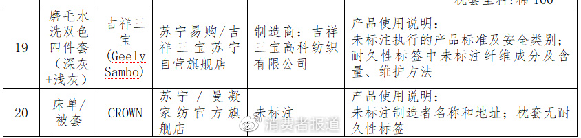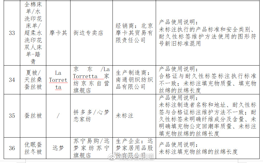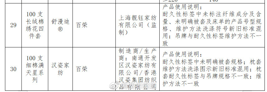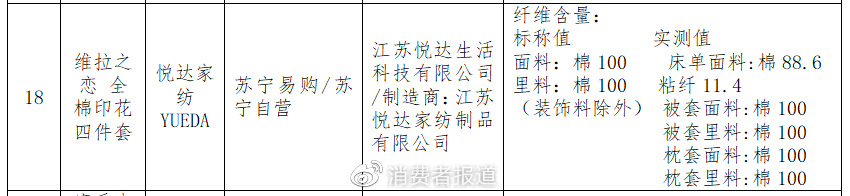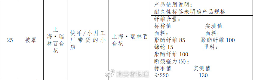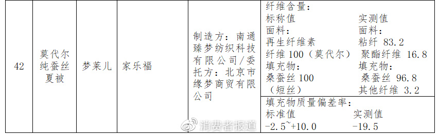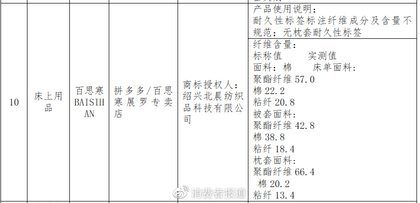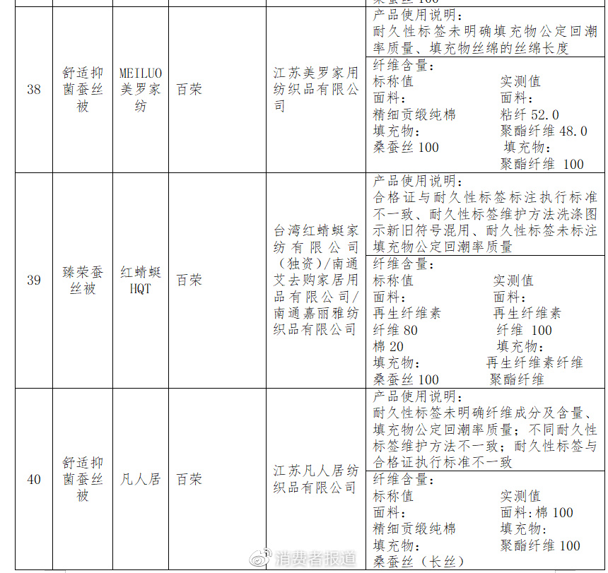 另外,标称商标为百思寒、悦达家纺、上海·瑞林百合花、研科、美罗家纺、红蜻蜓、凡人居、梦莱儿等床上用品也被检出纤维含量实测值与标称不符。