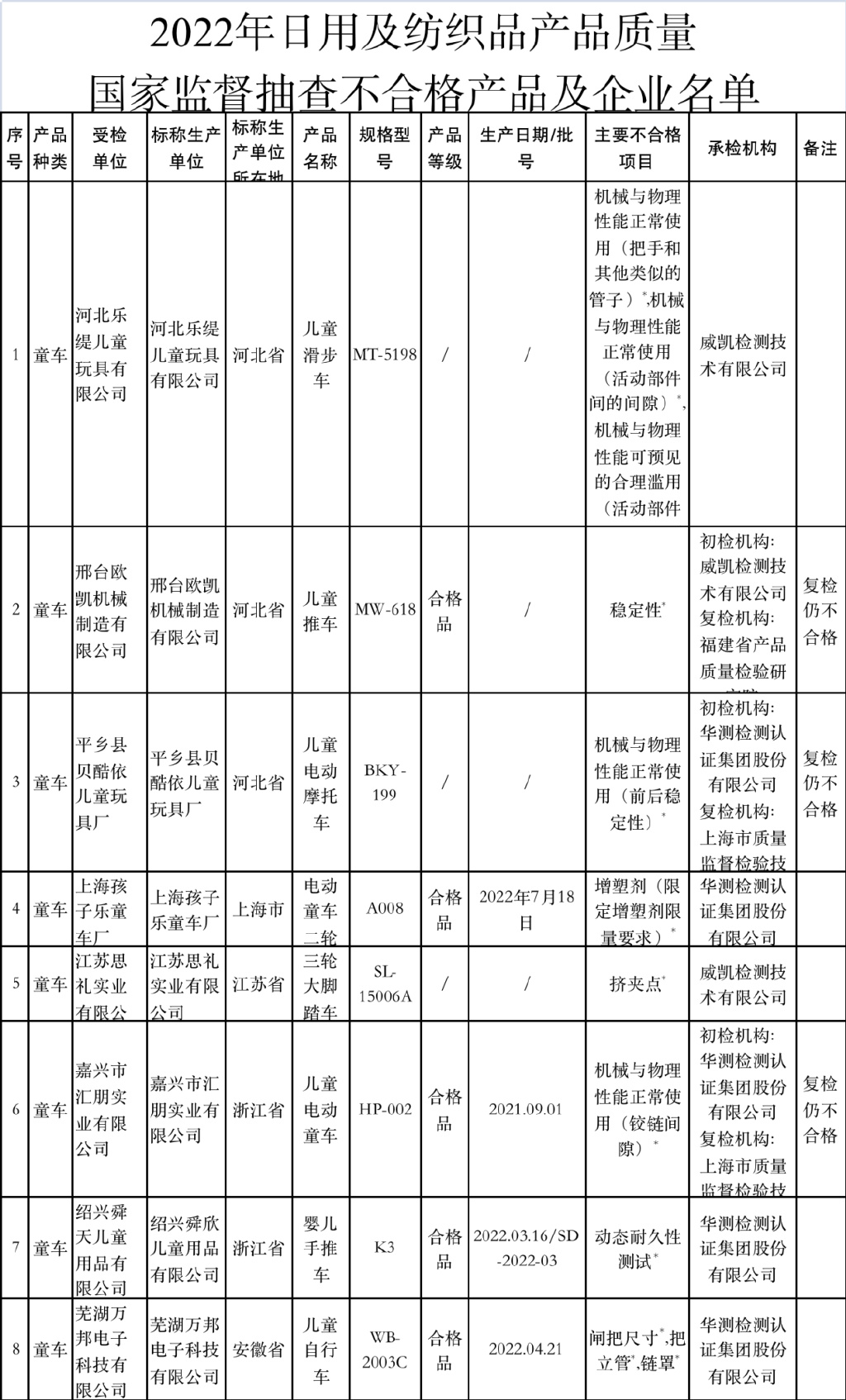 3月27日,国家市场监督管理总局公布了2022年日用及纺织品产品质量国家监督抽查情况。其中,此次抽查涉及童车、童鞋、机动车儿童乘员用约束系统,共检出59批次产品不合格。