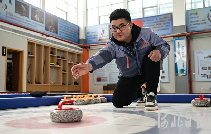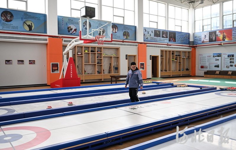 3月16日,在定州市河北金特力斯体育设施有限公司冰雪运动体验中心,工作人员正在测试陆地冰壶产品。
