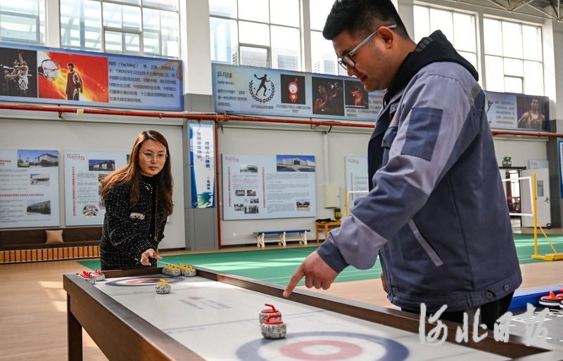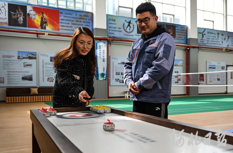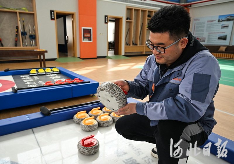 3月16日,在定州市河北金特力斯体育设施有限公司冰雪运动体验中心,工作人员正在测试桌上冰壶产品。