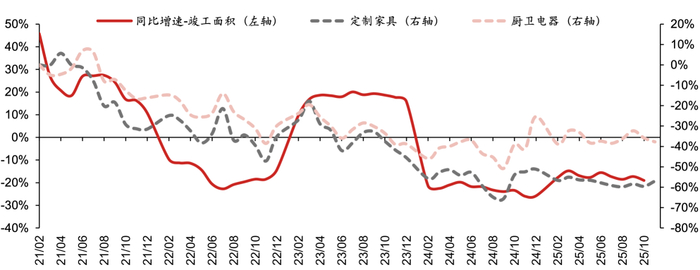 展望2026年,我们预计地方政府出台新一轮购房限制调整与刺激性政策的可能性在10月住宅销售价格指数下跌速率加速后已有所提升,而这也将助力地产后周期相关标的实现估值修复。至于基本面方面,我们预计2026年国内二手房交易与商品房竣工的合计套数同比下降4.8%,略优于2025年的同比下滑5.9%,住宅交易性需求下滑预示家装总需求仍将下滑,因此我们预计地产后周期企业的基本面仍将在2026年承压。