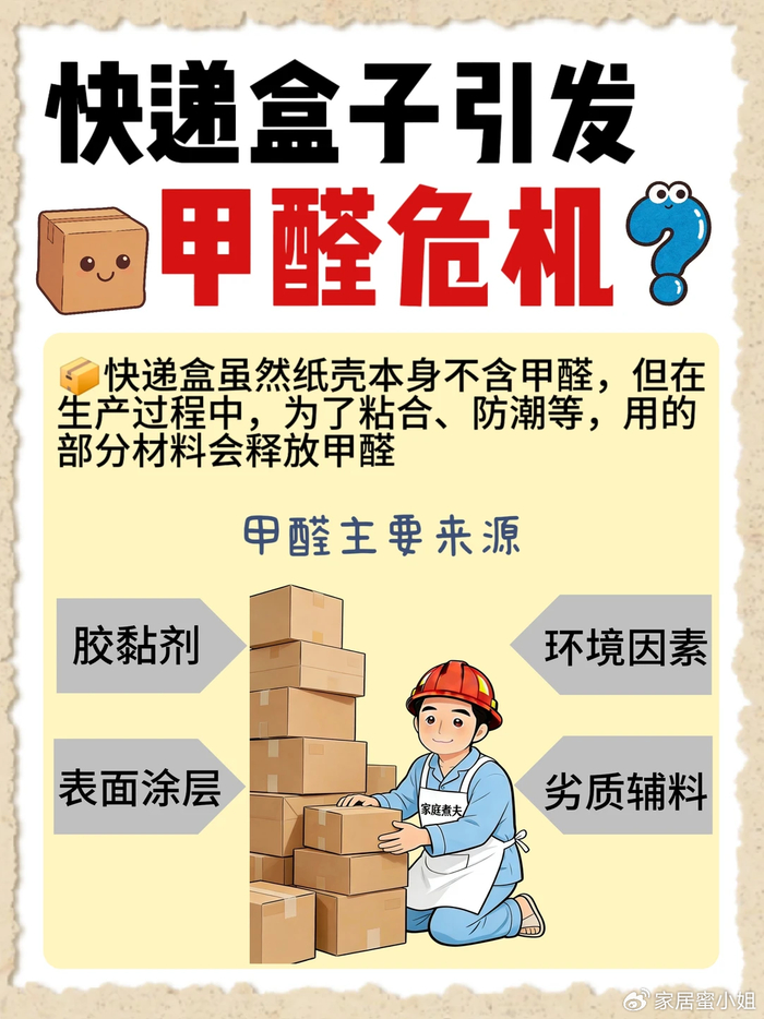 当然了,这些粘合剂中还含有大量的甲醛。如果你把它们攒在家里,不仅会污染家里的空气质量,还会滋生细菌,纸箱子上还可能携带虫卵。