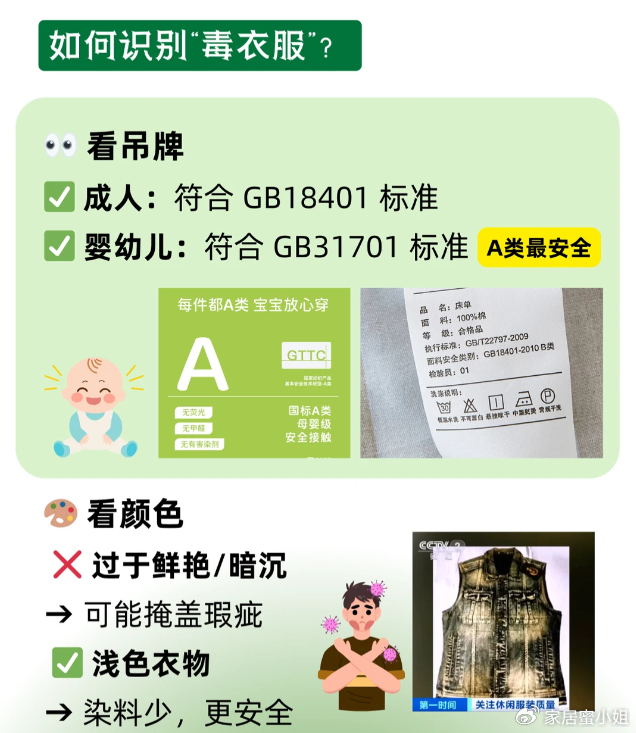 再就是要学会看衣服吊牌,必须符合执行标准。