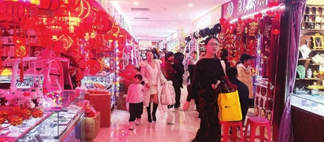 2月9日下午3时许,下元商贸中心迎来了一天中的人流高峰。在负一层记者看到,多家销售民俗产品的店铺内都有顾客在挑选自己心仪的春节用品。在一摊位前,销售大姐正在给顾客们展示,只见她轻轻一摁,就将一副红彤彤的对联吸到了自家卷闸门上,“这是今年新款的磁吸式对联,和老款纸质对联完全不一样。”看着许多顾客被吸引,大姐继续说道,“这种磁吸对联用的是3毫米加厚的立体植绒毛毡,摸起来软软的,还是多层立体设计,对联烫金字体亮晶晶的,不掉绒不褪色,揉捏完还能恢复原状。”